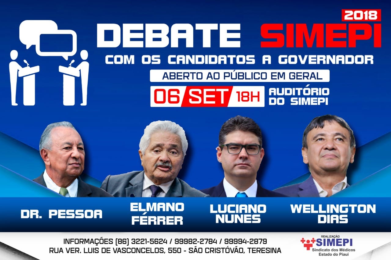 Seguindo a tradição, o SIMEPI realizará um debate com os quatro candidatos a Governador mais bem colocados nas últimas pesquisas. O debate acontecerá no dia 6 de setembro, às 18h, onde os candidatos convidados, Dr. Pessoa, Elmano Férrer, Luciano Nunes e Wellington Dias, poderão falar sobre suas propostas referentes à saúde pública. A mediadora será a jornalista Cláudia Brandão.