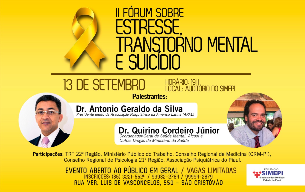 Abraçando a causa do Setembro Amarelo, o Sindicato dos Médicos do Estado do Piauí realizará o II Fórum sobre Estresse, Transtorno Mental e Suicídio. O evento acontecerá no dia 13 de setembro, às 19h, e terão como palestrantes Dr. Antonio Geraldo da Silva, presidente eleito da Associação de Psiquiatria da América Latina (APAL) e Dr. Quirino Cordeiro Júnior, Coordenador-Geral de Saúde Mental, Àlcool e Outras Drogas do Ministério da Saúde.